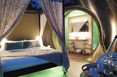 Las Burbujas Albarari: Situadas en un entorno natural impresionante, estas burbujas transparentes permiten disfrutar de las vistas panorámicas y del cielo nocturno desde la comodidad de una cama lujosa, creando una experiencia íntima y mágica.